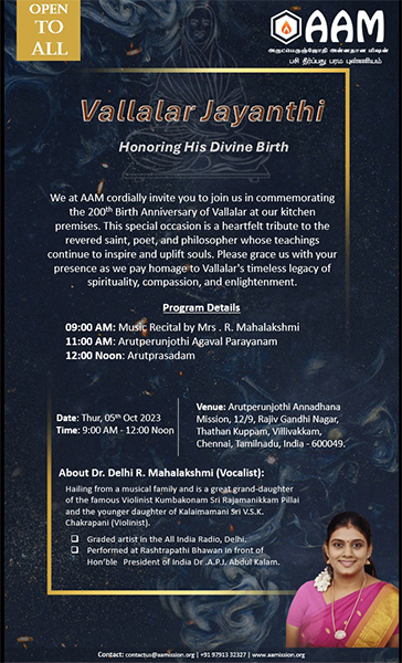 We at AAM cordially invite you to join us in commemorating the 200th Birth Anniversary of Vallalar at our kitchen premises. This special occasion is a heartfelt tribute to the revered saint, poet, and philosopher whose teachings continue to inspire and uplift souls. Please grace […]